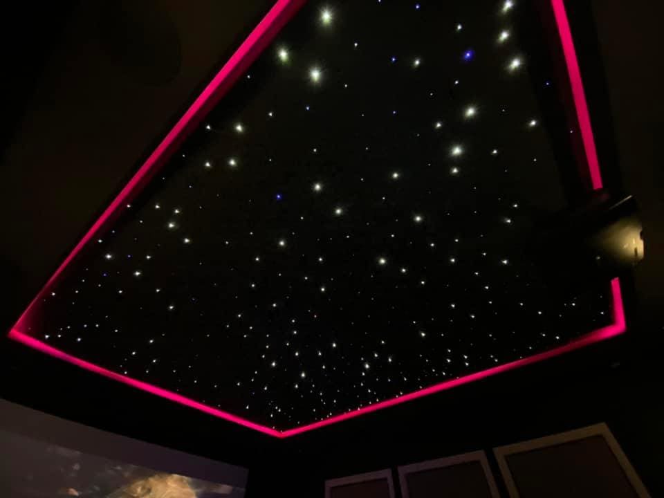 This project involved installing an Epson 4K projector for full screen vibrant visuals, along with in wall and in ceiling speakers for that true Dolby surround sound experience- all calibrated to achieve optimum sounds and picture. You simply MUST turn the sound up on the video to get a sample of it for yourself! And who could forget the piece de resistance – the Starlight Ceiling and RGB LED strip lighting for that complete transportation to another world.