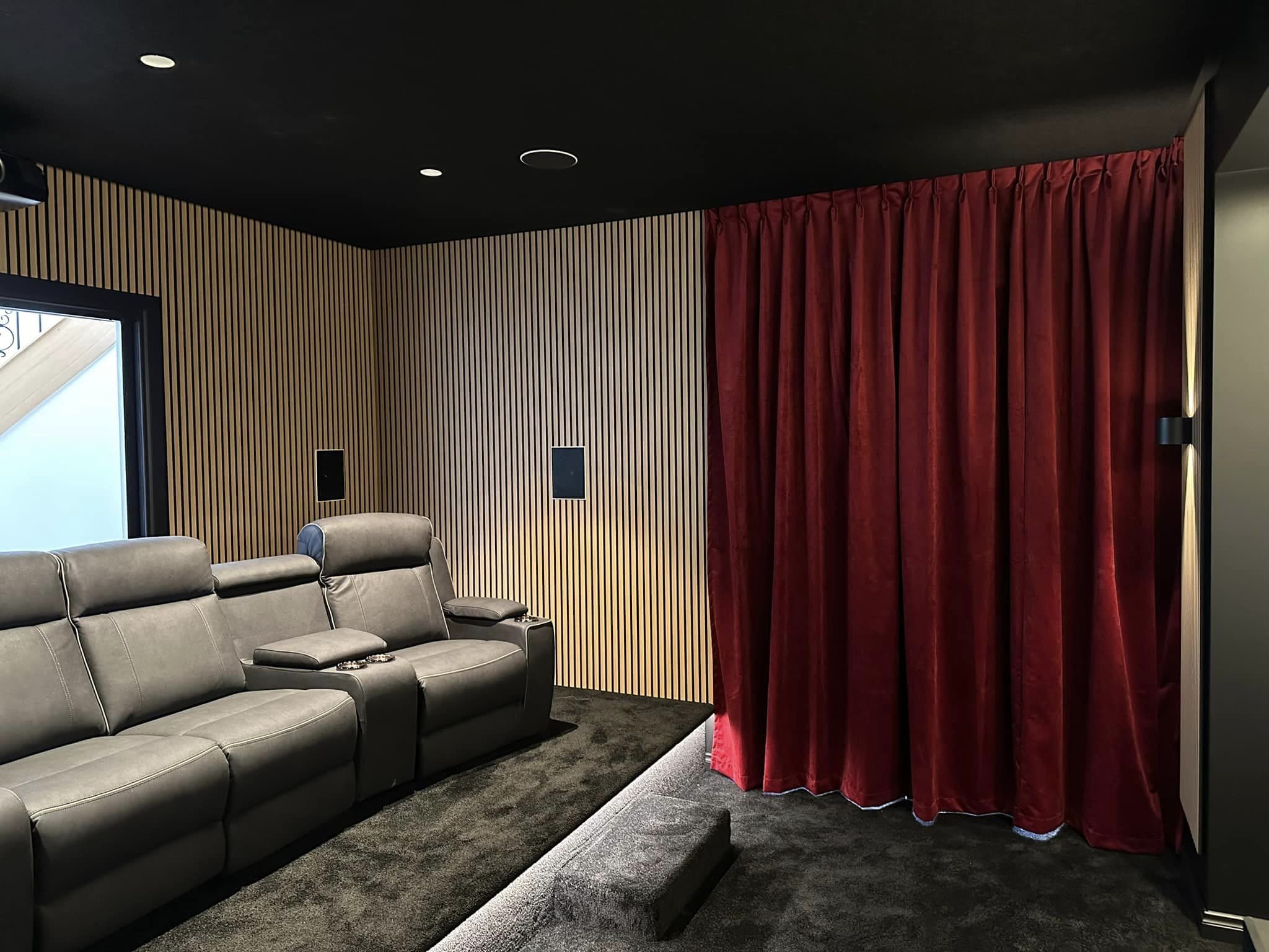 Comfort is key in any home cinema theatre room, and this installation does not disappoint. The room features a raised timber platform, custom-built as part of the carpentry works, ensuring that each of the charcoal-colored electronic recliners provides an unobstructed view of the screen. The plush black carpeting and luxurious red velvet cinema acoustic curtains not only enhance sound quality but also add to the room’s overall opulence.