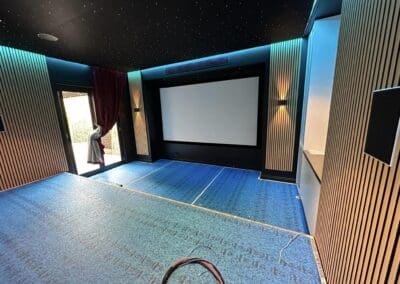 Beyond its technical prowess, this home cinema theatre room is a marvel of interior design. Acoustic Timber Slat panels line the walls, not only enhancing the room’s acoustics but also adding a touch of elegance to the space. The ceiling is a starry wonder, featuring an RGB Star Light Ceiling that can be controlled via an app, allowing for customisable ambient lighting. To further enhance the cinematic atmosphere, LED strip lighting was installed along the ceiling perimeter and under the raised platform, providing a soft glow that can be adjusted through the Tuya app. The combination of front up/down wall lights and 7 black LED downlights completes the lighting scheme, creating a theatre-like environment in the comfort of home.