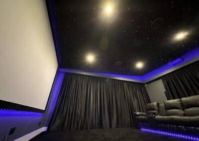 What really sets the home theatre room off are all the luxury aesthetic finishes, from The Sky@night star light ceiling which adds a touch of magic, transforming the home theatre into a celestial experience, along with the ceiling LED strip lighting offering adjustable ambiance. The room is also adorned with Belair twist jet black carpeting and black velvet cinema acoustic curtains, ensuring both acoustic excellence and aesthetic appeal. Lastly, the Manhattan electronic recliners offer the ultimate in comfort, allowing viewers to relax in style. And to really enhance the experience, our team installed 4 x Dayton Bass Shakers, delivering a tactile dimension to the audio, making every scene more engaging- check out the installation photos in the gallery below! Every detail, from the painting to the precise installation of all cabling, was handled by our skilled professionals, ensuring a flawless finish.