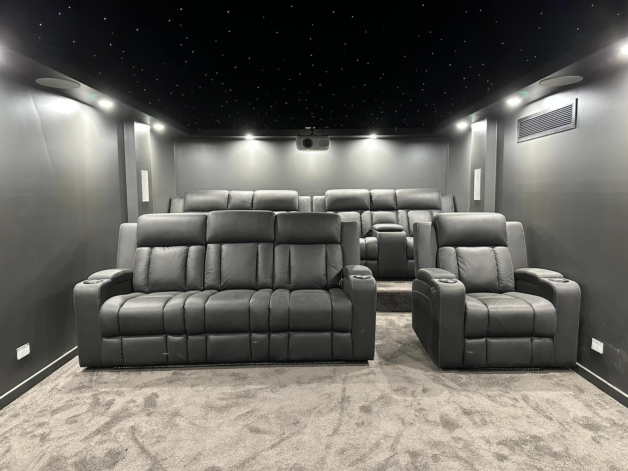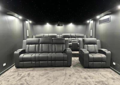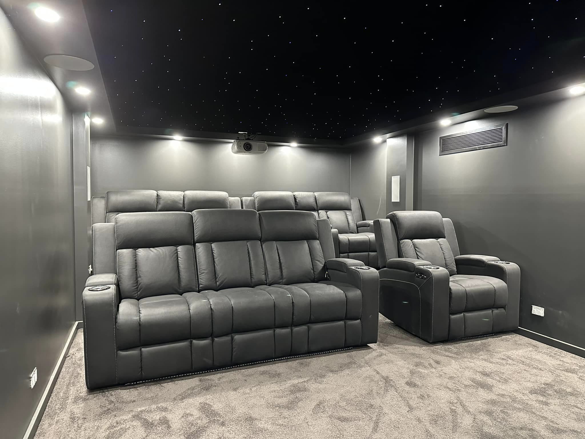 The project included all building works to prep the room including all carpentry and gyprock, to lay a blank canvas for the installation of all hardware and equipment, including the amazing 120″ screen which, paired with the Epson 4k Projector, brings the room to life visually. Also installed was a Marantz receiver, hooked up to the surround sound system, with bass shakers in all seating for that truly immersive sound. Lastly, a raised platform was installed to make way for the comfortable, luxe seating you see, creating multiple viewpoints for up to 8 lucky viewers! All beneath a starry night ceiling – pure bliss!