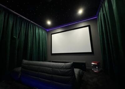 To further enhance the comfort and visual appeal, the home cinema room was fitted with plush carpeting, adding warmth and a soft underfoot. Green velvet cinema curtains were installed, not only for their aesthetic appeal but also for their sound-dampening qualities. The home cinema room was given a fresh coat of paint in a color that complements the overall theme and enhances the cinematic ambiance.